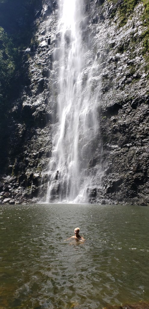 So, at just past the 6-mile mark, we find ourselves in the Hanakoa Valley. A friend had told us that this is the waterfall we should try to see. We split off the Kalalau Trail and onto the Hanakoa Falls Trail. We are on this trail for about a half a mile until we reach Hanakoa Falls – the climax of our hiking experience.